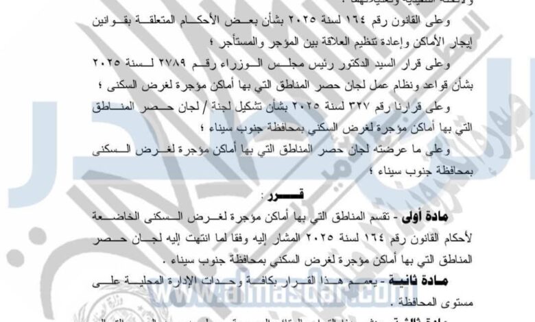 لجان حصر «الإيجار القديم» قرار محافظة جنوب سيناء، رقم ٤٠٠ لسنة 2025 ، بتقسيم المناطق التي بها أماكن مؤجرة لغرض السكنى الخاضعة لأحكام القانون رقم 164 لسنة 2025 المشار اليه وفقا لما انتهت إليه لجان الحصر وتقسيم المناطق إلى (متميزة-متوسطة-اقتصادية) على مستوى الأحياء والمراكز والمدن .